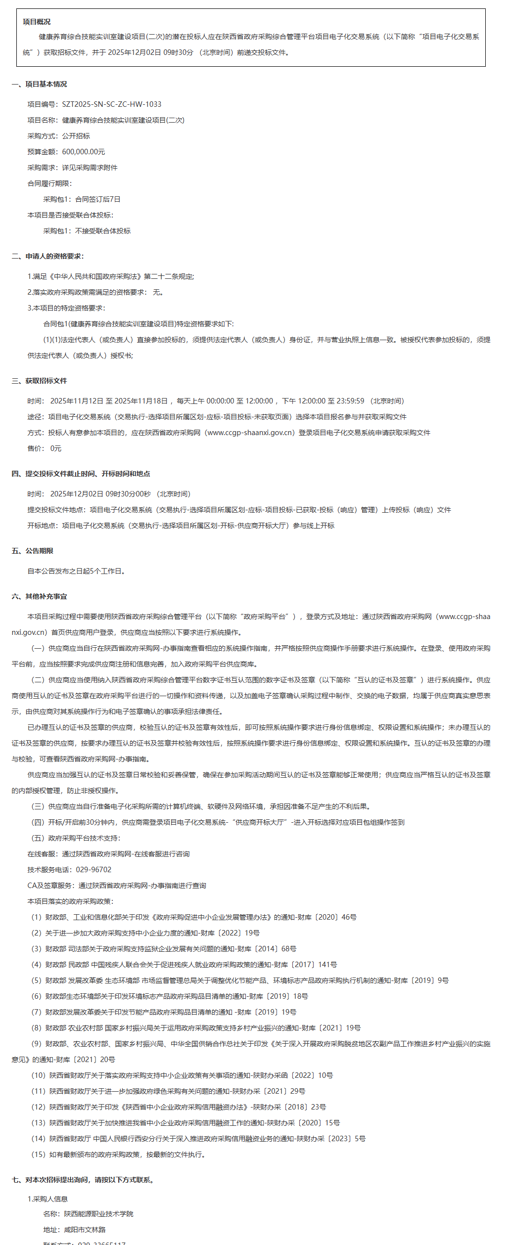 陕西能源职业技术学院健康养育综合技能实训室建设项目(二次)招标公告